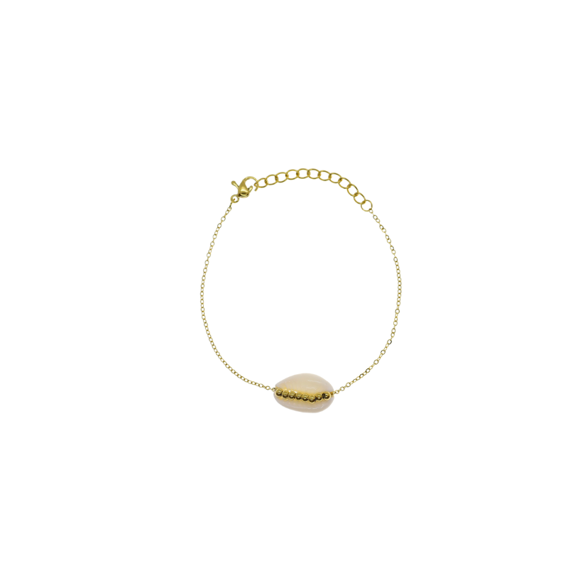 Pulsera cadena fina con charm concha natural y bolitas mini.