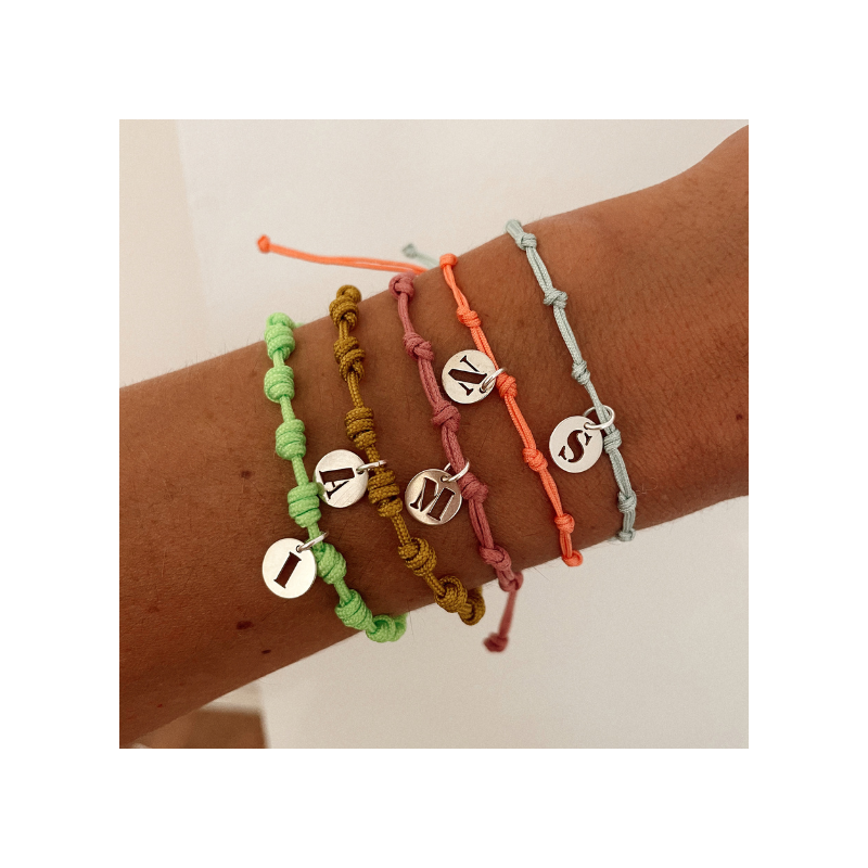 Pulsera nudos con charm inicial troquelada en Plata de Ley.
